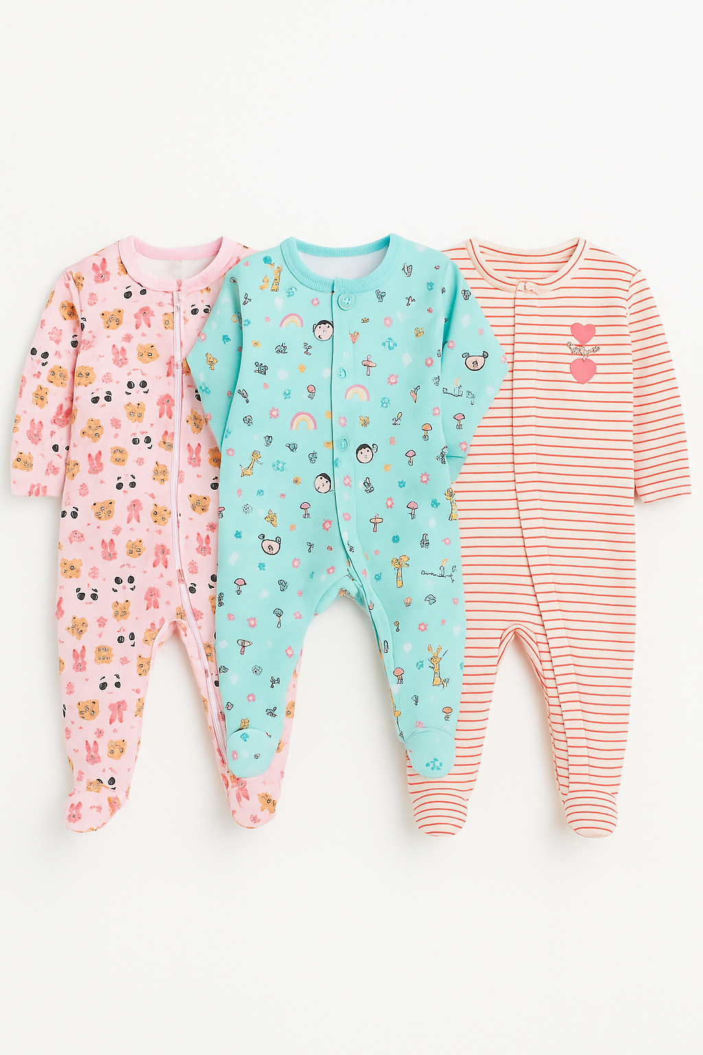 3 Macacões no tecido suedine, ambos possuem zíper por toda extensão (facilitando a troca n bebê), pé fechado, proteção no pescoço e etiqueta bordada.
