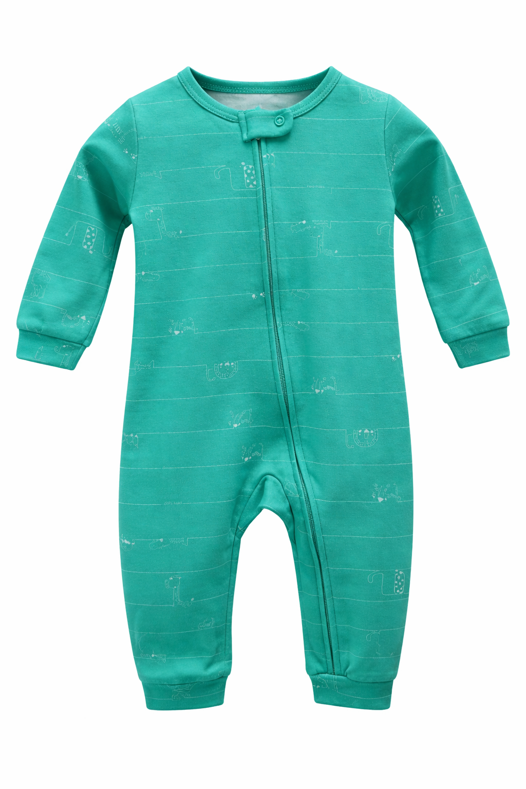 Macacão no tecido suedine 100% algodão, o macacão possui estampa de animais, zíper em toda extensão, facilitando assim a troca do bebê.