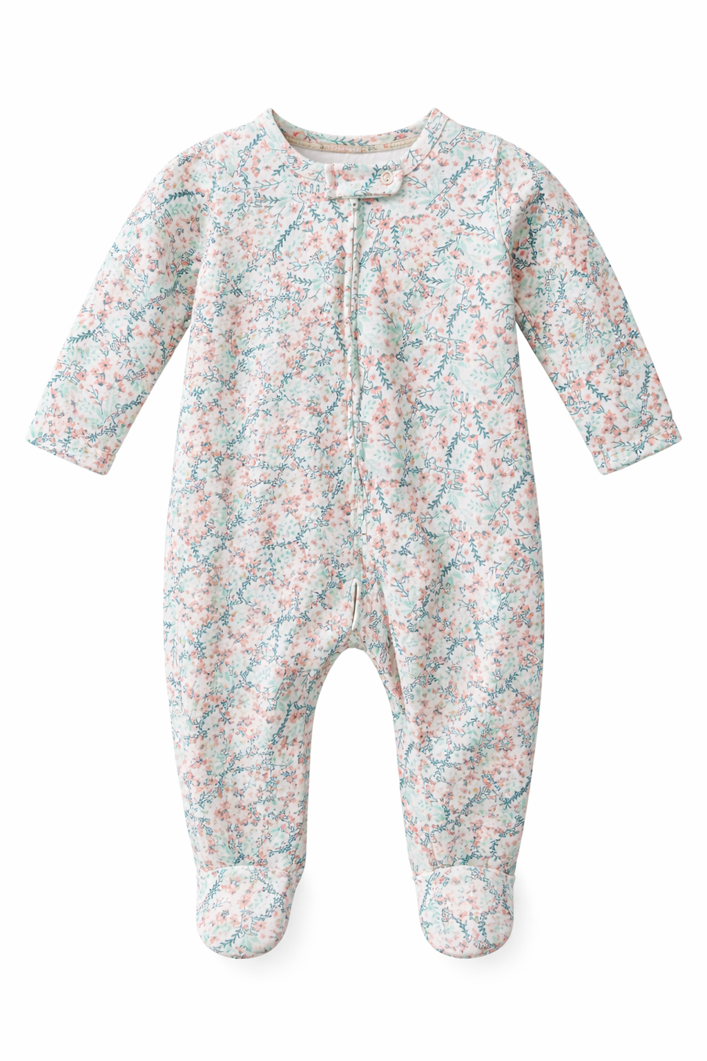 Macacão no tecido suedine 100% algodão, o macacão possui estampa de dinossauro e flores, zíper em toda extensão, facilitando assim a troca do bebê.