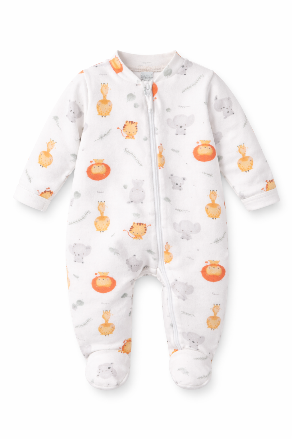 Macacão bebê confeccionado em suedine fio 40 100% algodão, tecido de alta qualidade, extremamente macio e ideal para a pele sensível do bebê. Modelo de manga longa, com zíper frontal, proporcionando praticidade no dia a dia e mais conforto para o bebê.